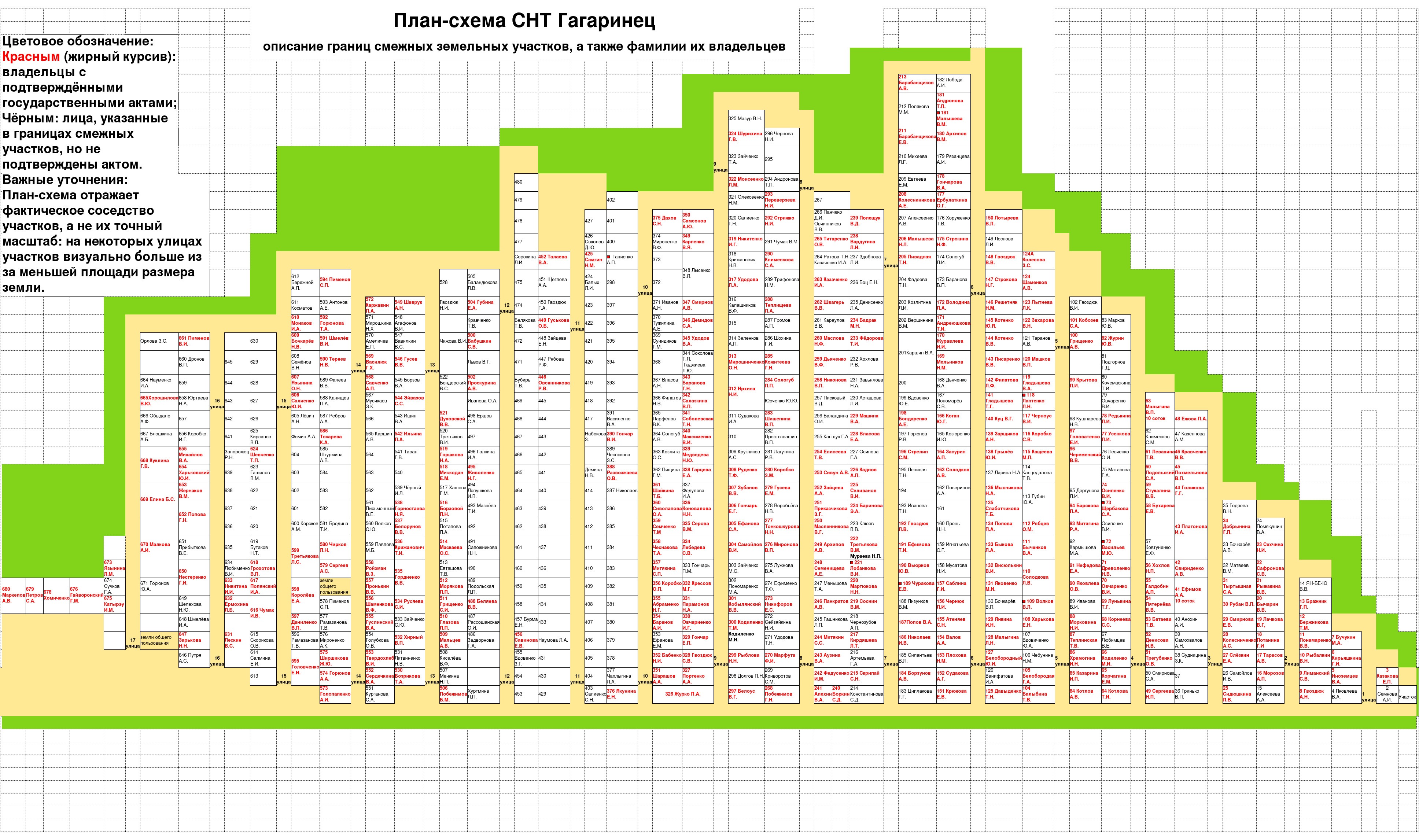 В 2024 году предыдущий председатель СНТ «Гагаринец» Каренин В.Н. передал правлению 365 актов на 326 граждан. Это вторые экземпляры, которые должны были храниться в архиве. Вот почему нам отказывали в предоставлении копий! Я объединил данные из актов в единую план-схему, используя описание границ и фамилии владельцев. Для исключения ошибок я провёл перекрёстную проверку, сверяя соседей по каждому акту. В каждом акте указан чертёж границ и смежные участки.