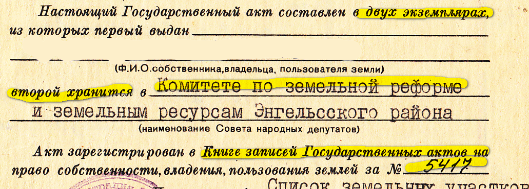Каждый «Государственный акт на право собственности на землю, пожизненного наследуемого владения, бессрочного (постоянного) пользования землёй» готовится в двух экземплярах: один для собственника, второй — для архива. Также существует «Книга записей государственных актов», где регистрируется каждый документ.