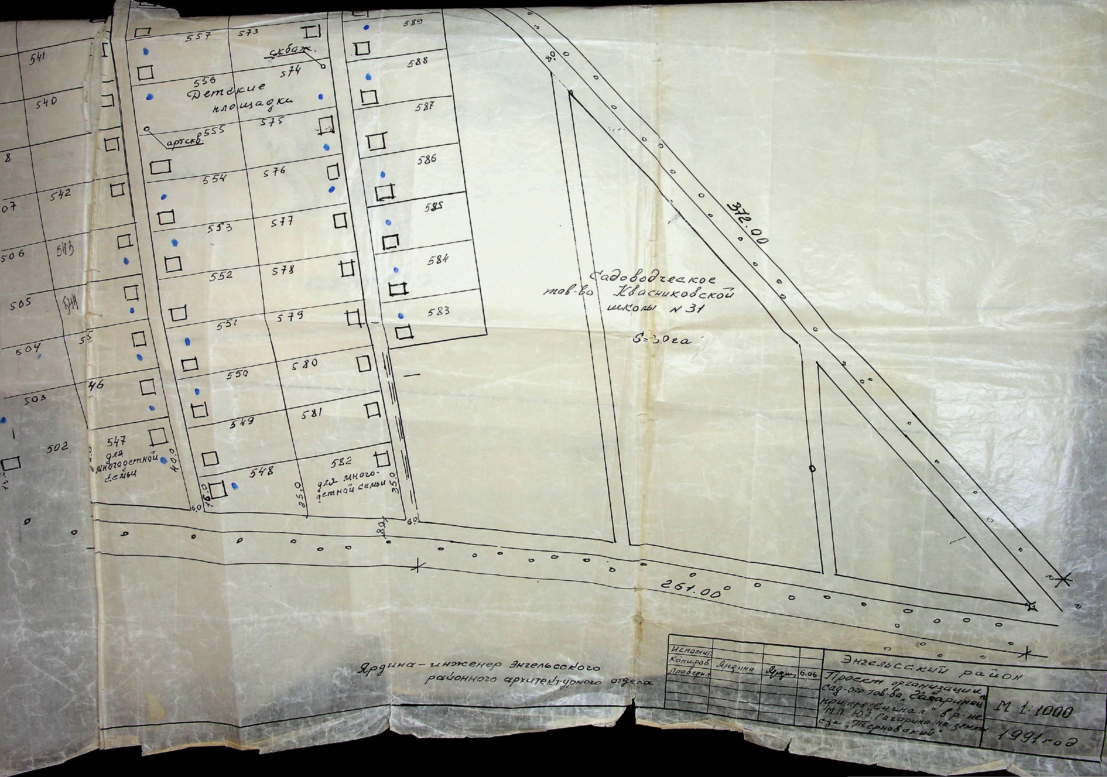 Я являюсь садоводом с момента выдачи земель в 1991 году. Земли выделялись на основании Решения № 136 от 10.04.1991 исполнительного комитета Энгельсского района «Об отводе земельных участков под коллективное садоводство». Этим решением земля была выделена организациям: Квасниковской школе №31 — 3 гектара, и п/о «Сигнал» — 56 гектаров. Эти участки находятся на одном поле.