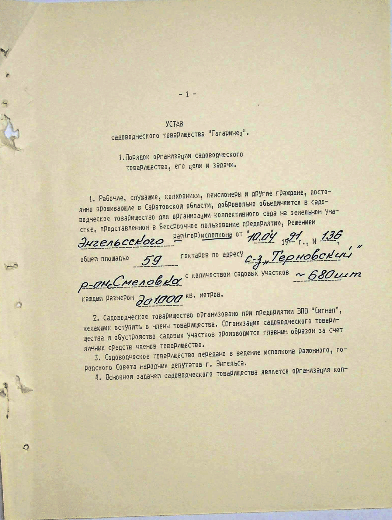 Устав СНТ «Гагаринец» утверждён решением общего собрания № 3 от 21 июня 1991 г. и зарегистрирован Постановлением Администрации Энгельсского района № 10 от 10 января 1993 г. То есть садоводы на первом и втором собраниях решили объединить СТ «Сигнал» и СТ Квасниковской школы №31 в СНТ «Гагаринец». В уставе прописано: