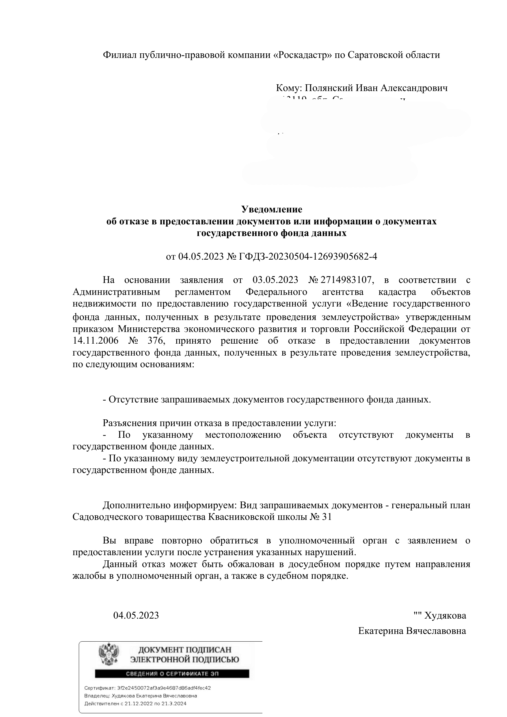 Это вызвало сомнения. Я заказал план СНТ «Гагаринец» через личный кабинет на Госуслугах, а затем и весь архив. Также я запросил план СТ Квасниковской школы №31, на что получил ответ, что плана нет.