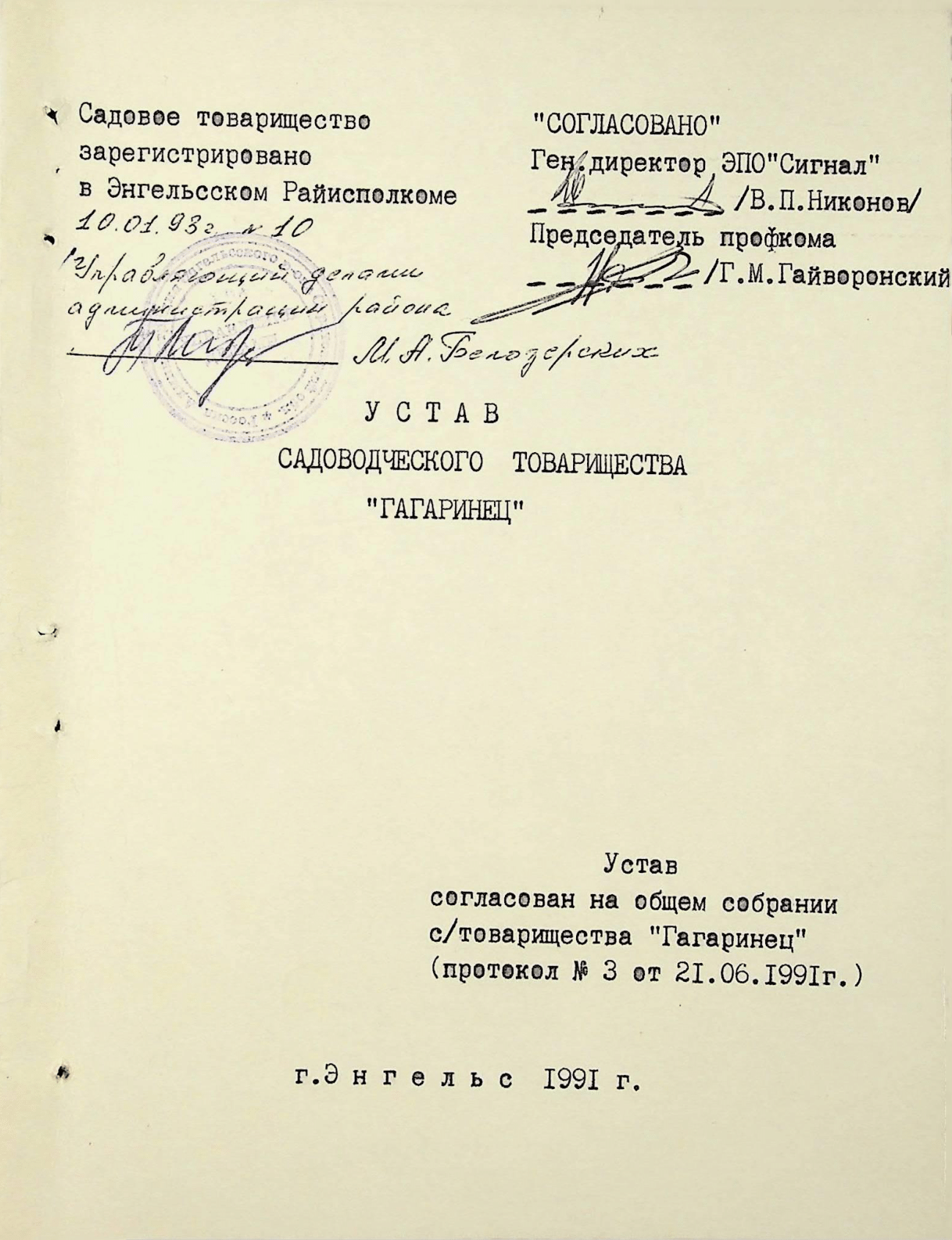 Устав СНТ «Гагаринец» утверждён решением общего собрания № 3 от 21 июня 1991 г. и зарегистрирован Постановлением Администрации Энгельсского района № 10 от 10 января 1993 г. То есть садоводы на первом и втором собраниях решили объединить СТ «Сигнал» и СТ Квасниковской школы №31 в СНТ «Гагаринец». В уставе прописано: